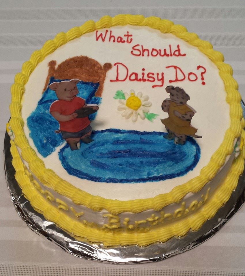 Is that not the cutest thing ever? Katie created that after looking at images of my picture book cover. Pete the Pig and Daisy Dog were made of paper and foam and were standing in Pete’s bedroom. The sides of the cake had “HAPPY BIRTHDAY MARIA!” and white daisy flowers. I can’t imagine of a better way to recreate that book cover. HUM – maybe I’ll have to get Katie to make one for a book signing or other Pete and Daisy event so that you can enjoy it to!!!